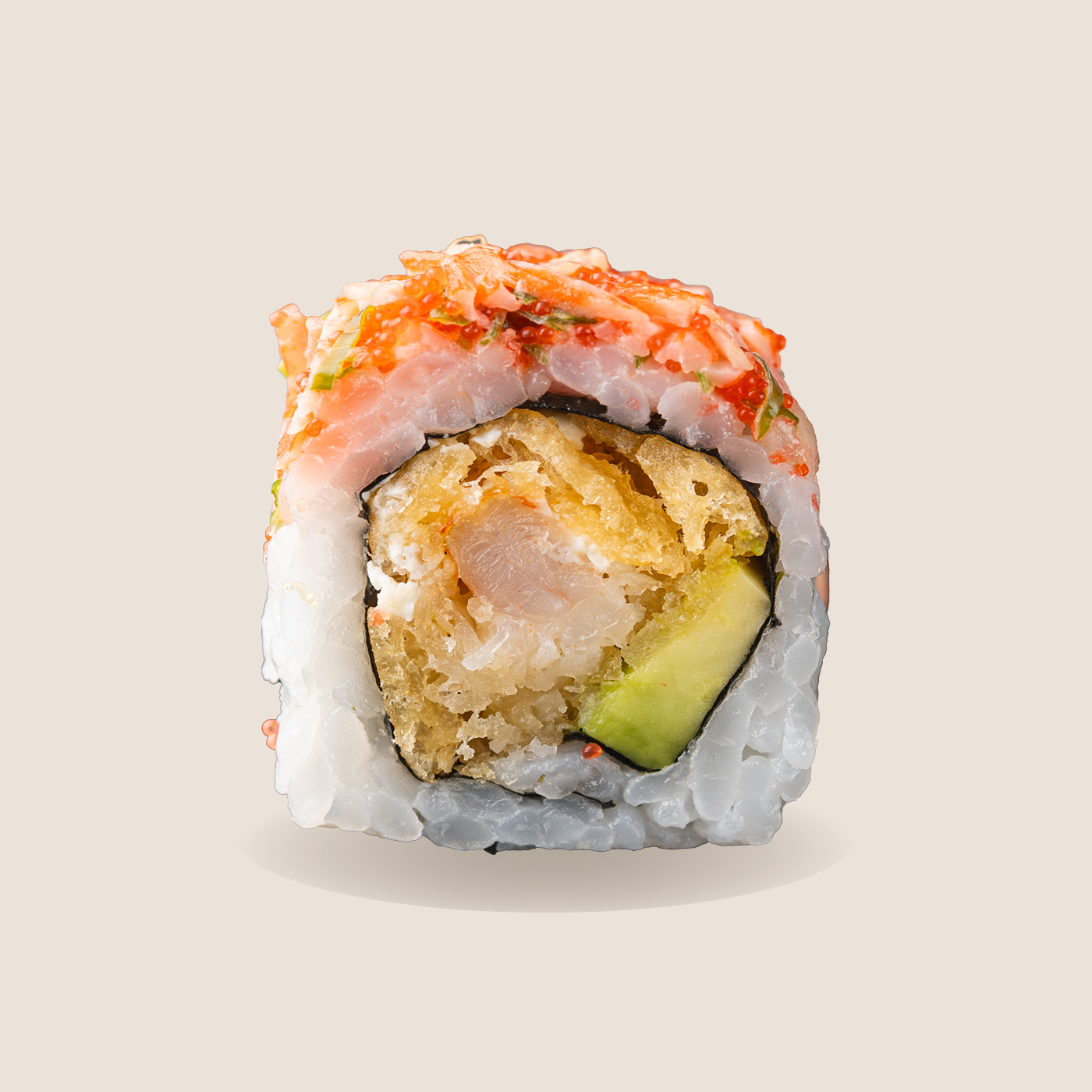 Prawn tempura, cream cheese and avocado topped with surimi, spicy mayonnaise, spring onions and red masago