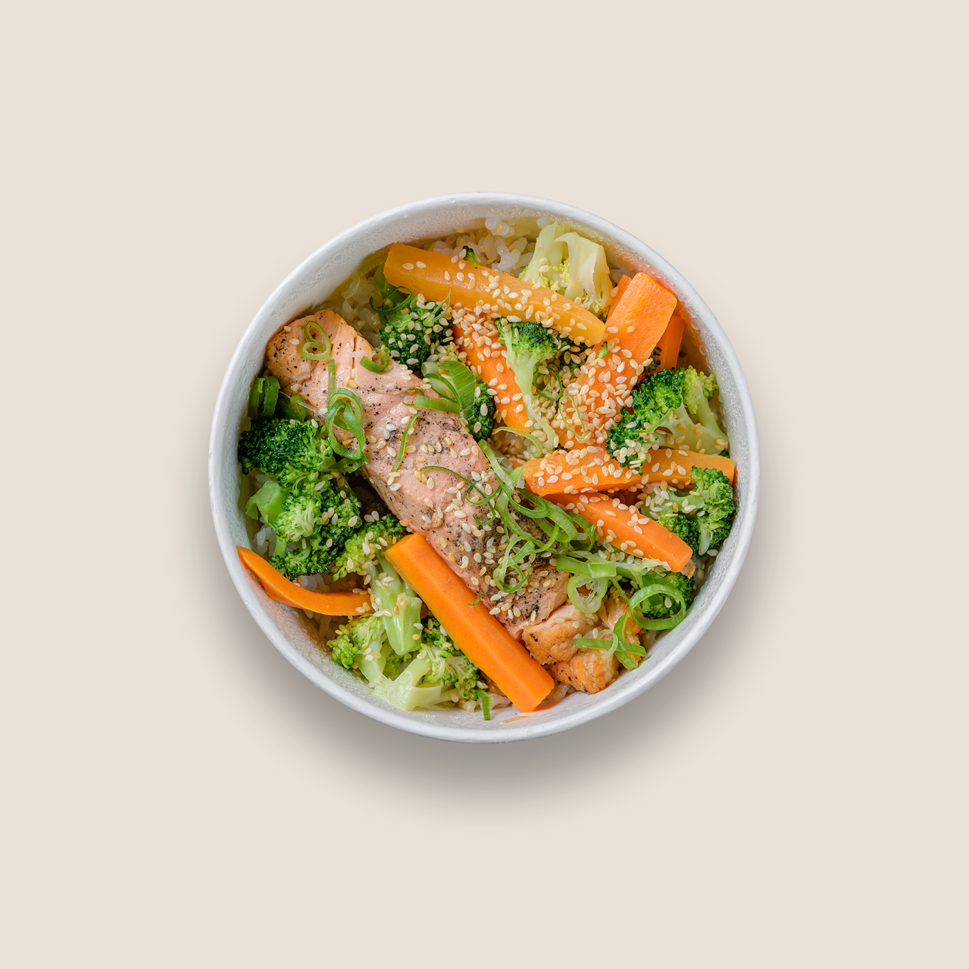 Salmon, broccoli, carrots, spring onions and sesame seeds on a bed of rice served with a side sauce