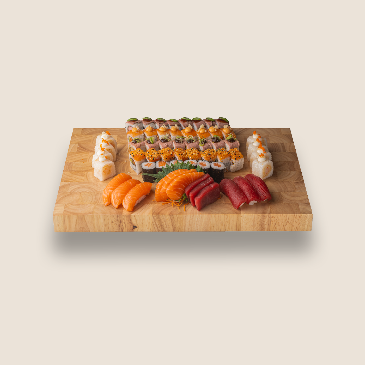 3 PIECES EACH OF – Salmon nigiri, tuna nigiri, salmon sashimi, tuna sashimi.              6 PIECES EACH OF – Sake maki. 8 PIECES EACH OF – Yoi Roll, rising sun roll, kanon roll, bifu roll, kamo roll.