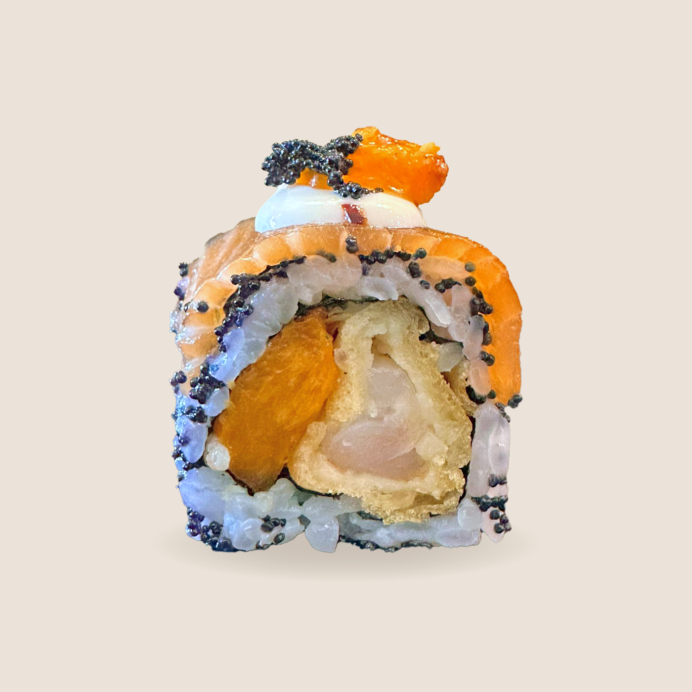 Tempura prawn, baked pumpkin with honey, chili flakes, mixed with lemon zest and hazelnuts), black masago, topped with salmon, mayonnaise, pumpkin and black masago.